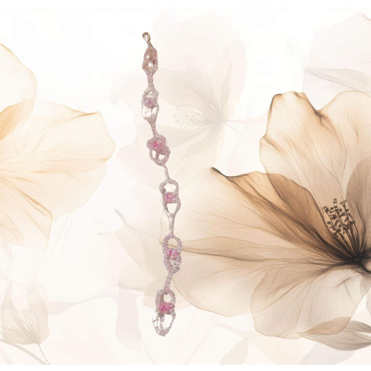 Ce bracelet léger et poétique est réalisé à la main avec des perles translucides rose pâle, montées sur fil dans un motif en boucle régulier.